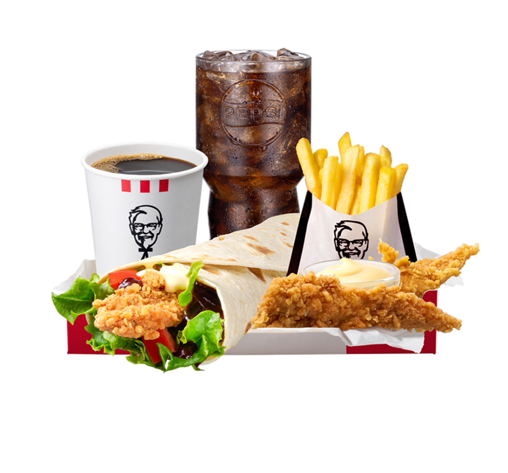i-Twister BBQ, 2 Stripsiä, pienet ranskalaiset, dippi, pieni juoma ja kahvi (0,24l).