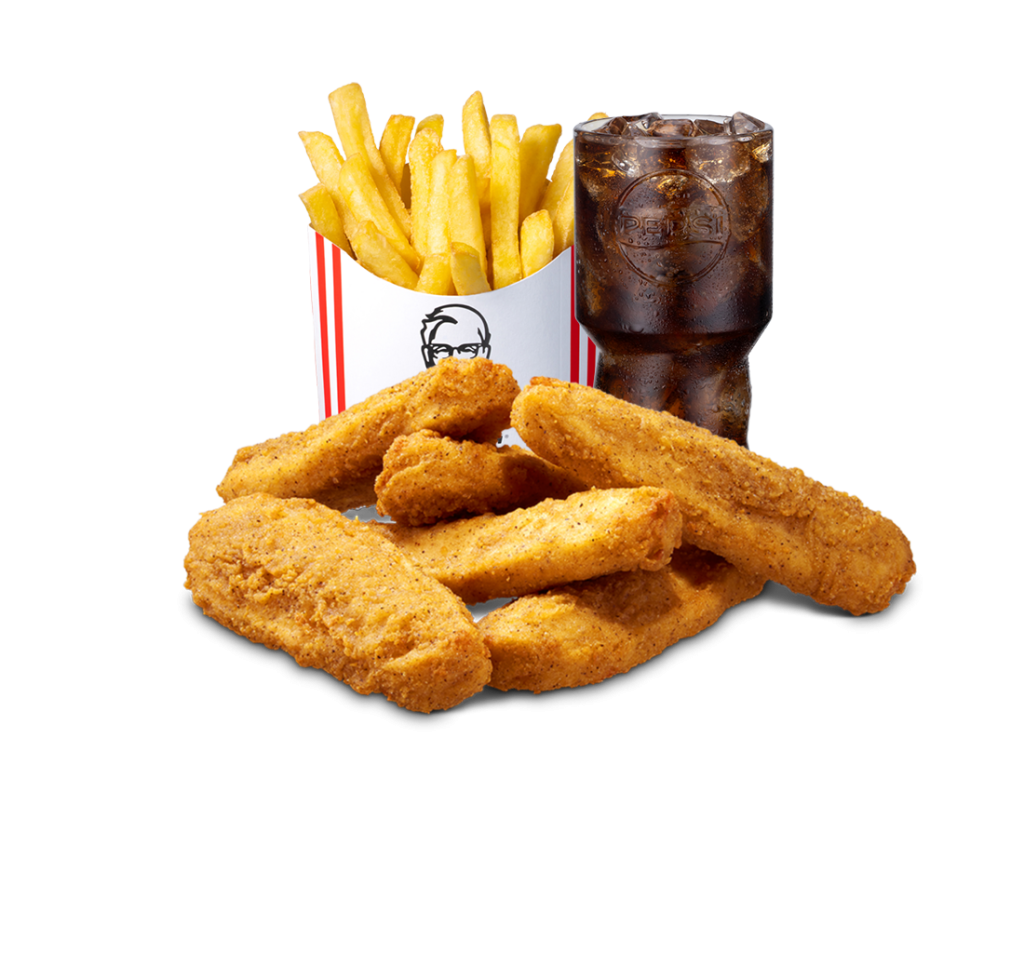 Veggie strips, KFC:n rapaudella ja alkuperäisellä reseptillä. Ateriaan kuuluu myös limu sekä ranskalaiset.