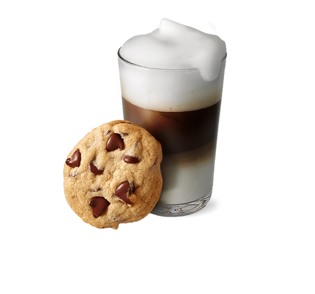 Lämmin kuppi espressoa, maitoa ja suklaakeksisiirappia.